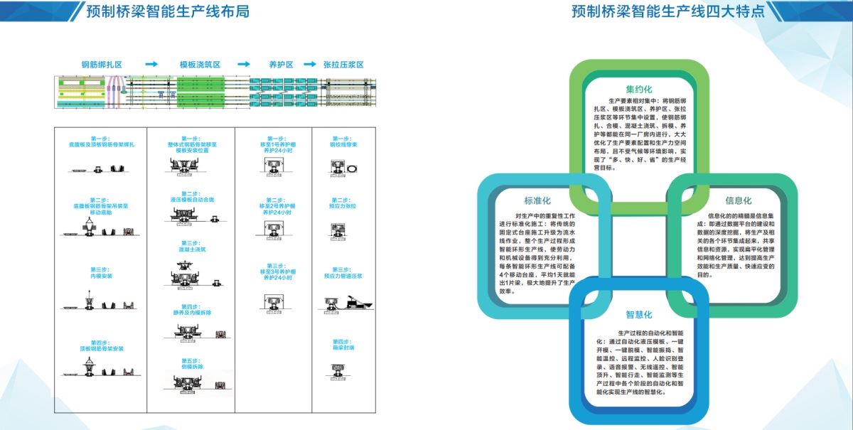 預(yù)制橋梁智能生產(chǎn)線新技術(shù)采用了“施工工序區(qū)域固定、流水線作業(yè)”的預(yù)制新模式:通過(guò)自行式移動(dòng)臺(tái)座將鋼筋綁扎區(qū)、模板澆筑區(qū)、養(yǎng)護(hù)區(qū)、張拉壓漿區(qū)和存梁區(qū)有機(jī)串聯(lián),實(shí)現(xiàn)橋梁預(yù)制施工的工廠化流水線作業(yè)。