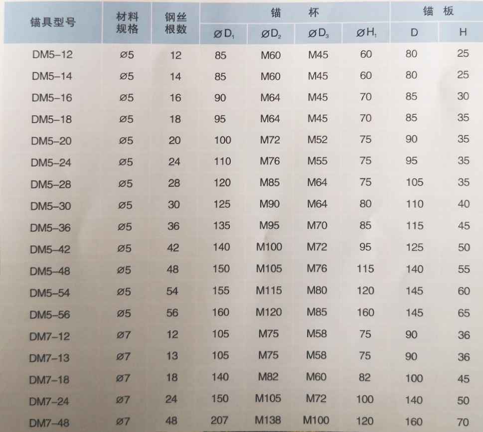 DM型鋼絲束鐓頭錨具系列:錨固標準強度為1470、1570MPa及其以上的? 5、? 7mm高強鋼絲束。主要用于后張法預應力混凝土結構及構件中。 錨板用于固定端。
